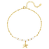 Hoe leuk is dit gouden enkelbandje met zeester en witte kralen? De enkelband heeft een verstelbare sluiting waardoor je de enkelband vanaf 22 tot en met 27 cm kunt dragen. De enkelband is perfect te combineren met meerdere gouden enkelbandjes. Ook leuk om juist voor een kleurrijke look te gaan en deze enkelband te combineren met kleurrijke sieraden.
